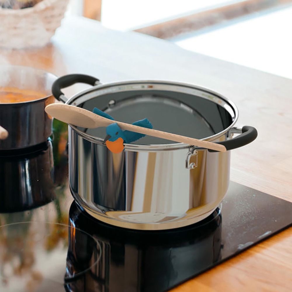 Einfach auf den Topfrand setzen, Deckel drauf und fertig. So kann der Dampf entweichen, das Wasser bleibt im Topf und die Nudelkatastrophe bleibt aus. Und wenn der Löffel mal eine Pause braucht? Ab aufs Vögelchen, ganz ohne Sauerei.